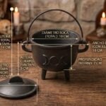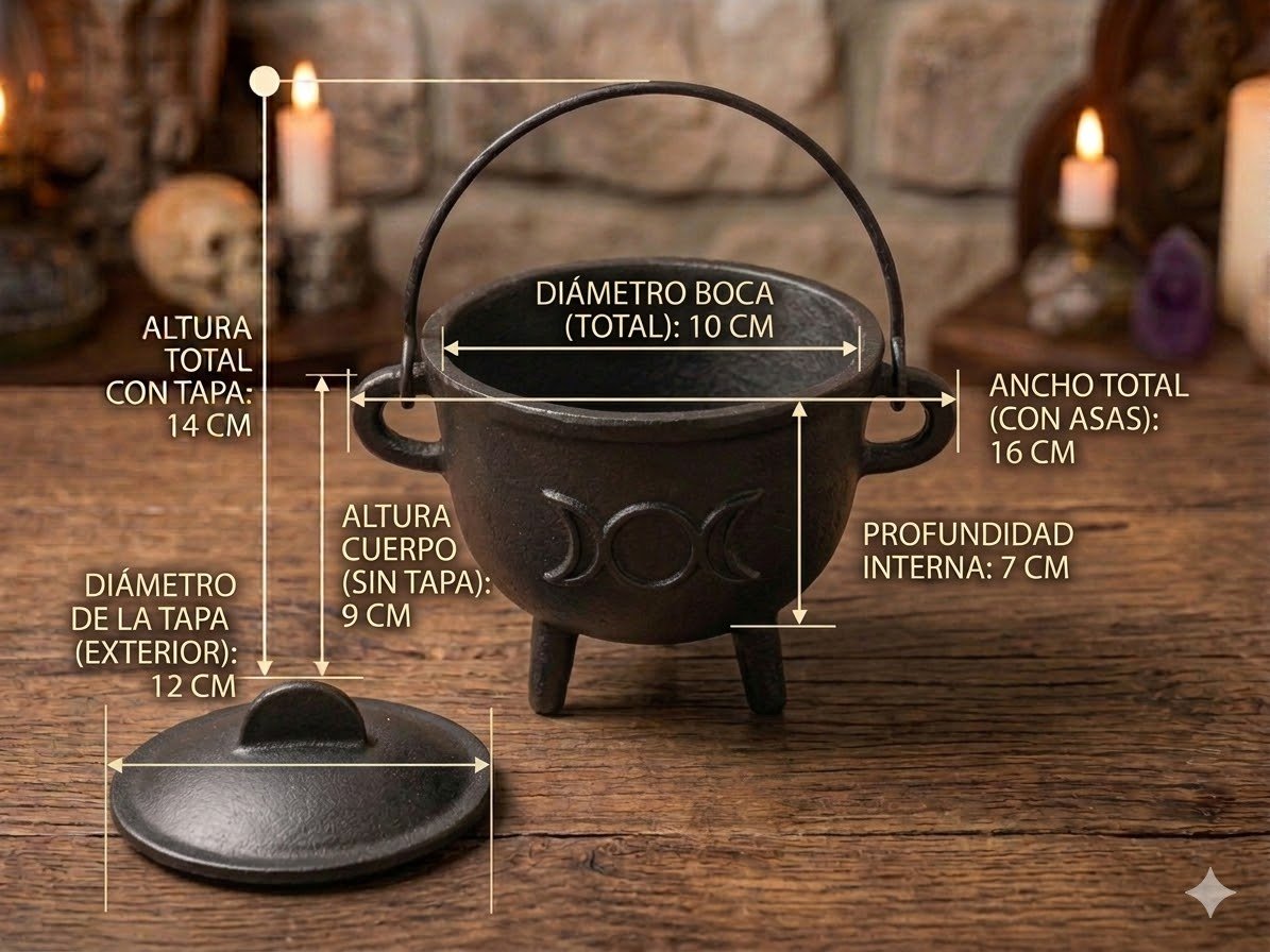 Especificaciones tecnicas. Material. Hierro fundido de alta resistencia. Color. Negro mate/Naranja. Formato. Tripode con manija metalica y tapa lisa. Uso recomendado. Sahumador, quemador de incienso y rituales de fuego.