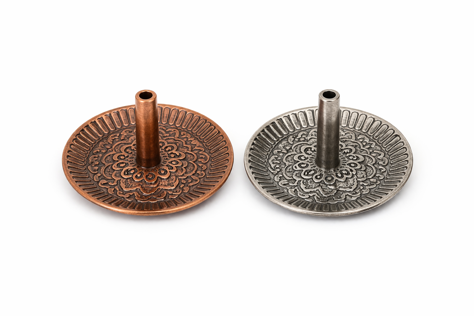 Fabricado en metal resistente, presenta un grabado tipo mandala con relieve que le aporta carácter y estética artesanal. El tubo central permite colocar sahumerios de varilla estándar, asegurando una correcta sujeción durante toda la combustión.