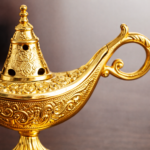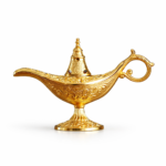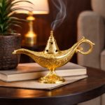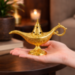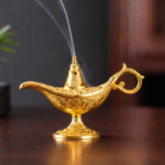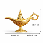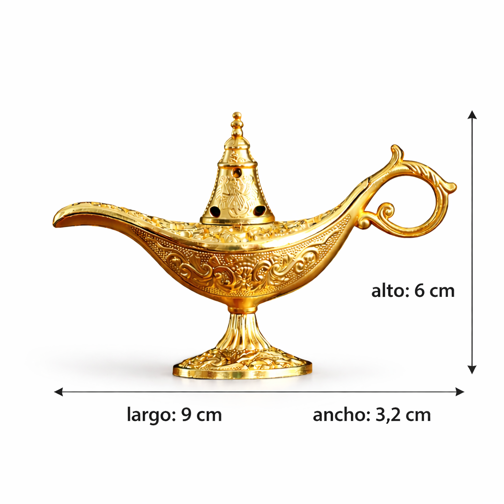 Quemador de incienso con diseño de lámpara mágica estilo Aladino, ideal para quienes buscan combinar decoración y aromatización en un solo producto. Su acabado dorado brillante y los detalles ornamentales le dan un estilo elegante y llamativo, perfecto para ambientar cualquier espacio.