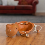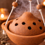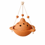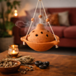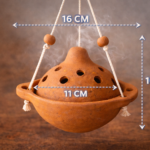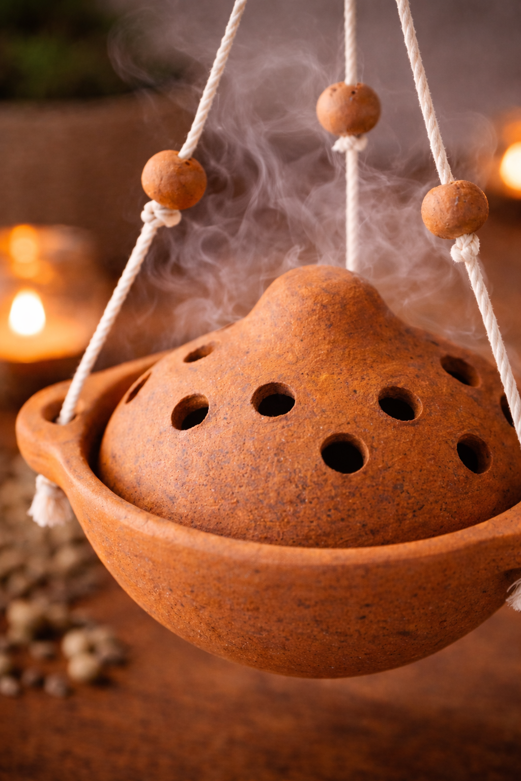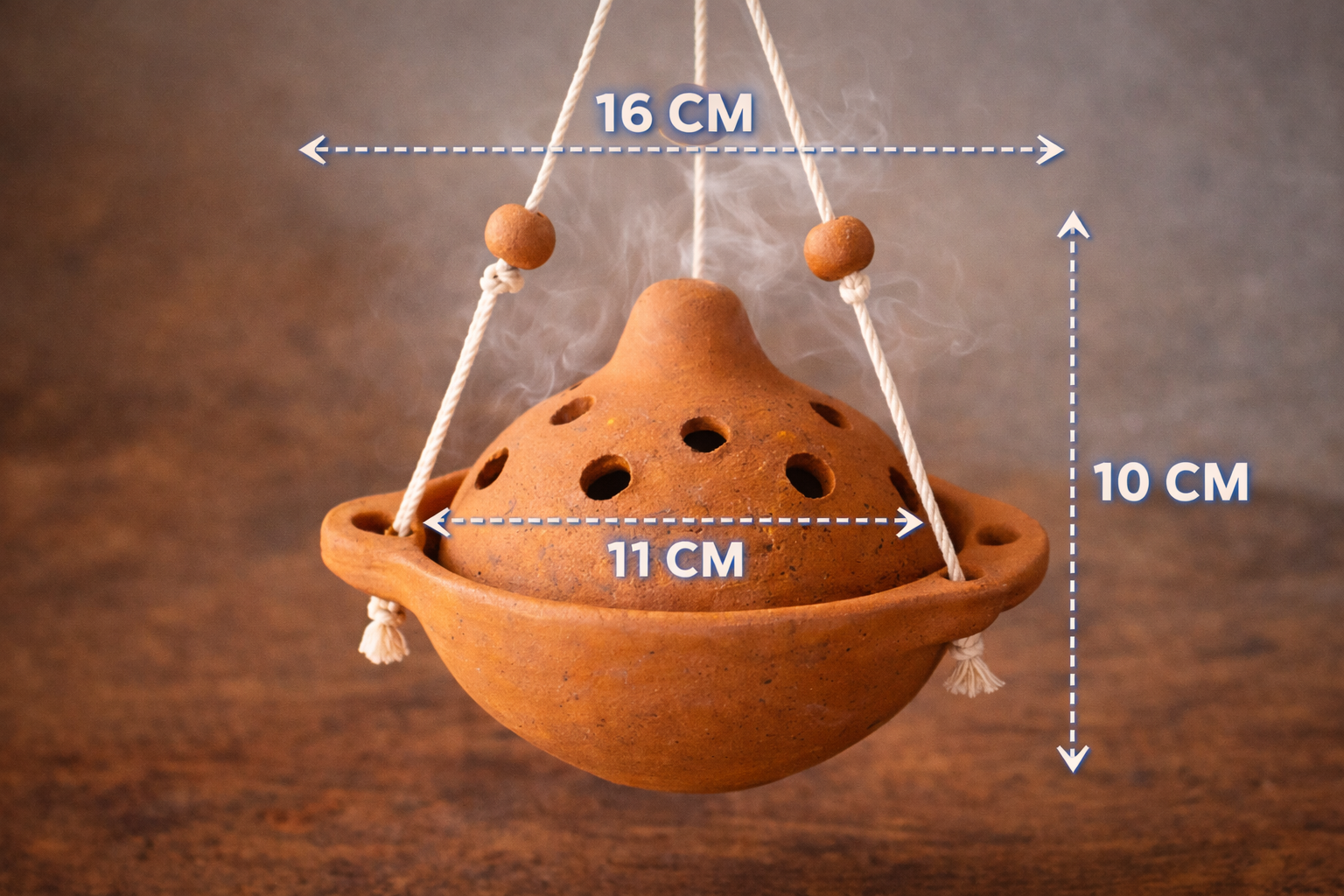 Fabricado en barro cocido, este sahumador combina funcionalidad y estética. Puede utilizarse con carbón vegetal, resinas, hierbas o sahumerios, adaptándose a distintos tipos de rituales o momentos de relajación. Su sistema colgante de tres cordones permite ubicarlo fácilmente en cualquier ambiente, aportando un toque rústico y natural a la decoración.
