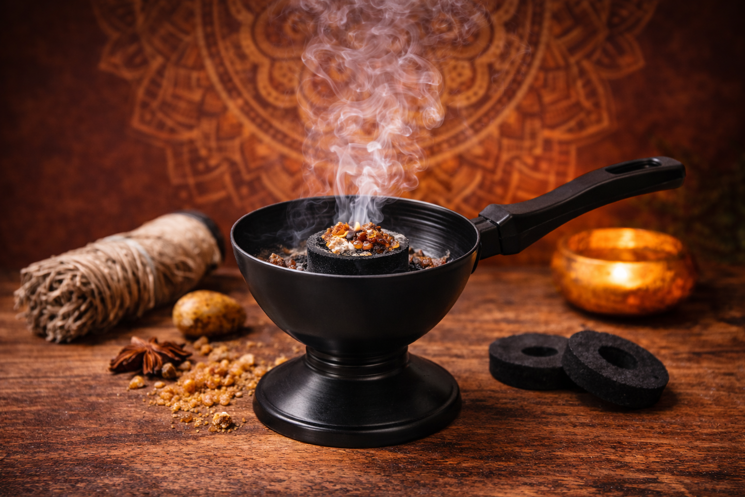 Es ideal tanto para uso personal como profesional en prácticas de sahumado, armonización de ambientes, meditación o terapias holísticas. Su formato portátil permite trasladarlo fácilmente por distintos espacios, acompañando cada proceso de limpieza o ritual.