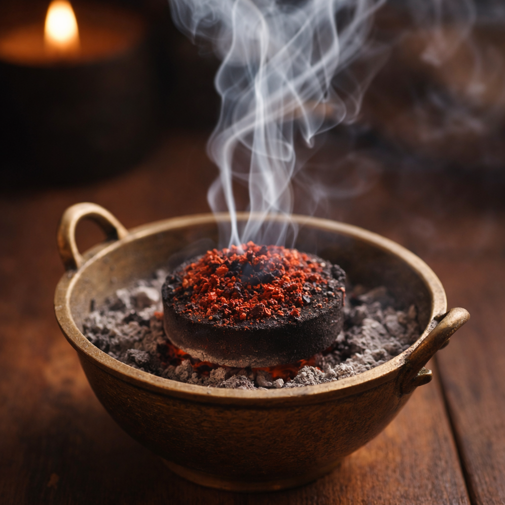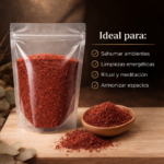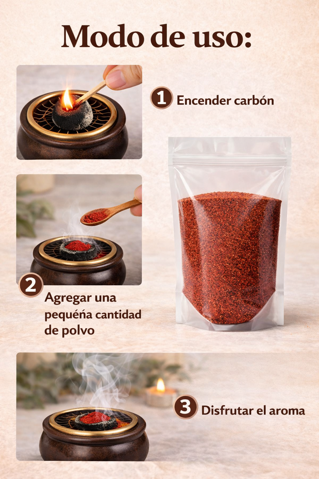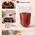 Modo de uso: encender un carbón vegetal dentro de un sahumador, esperar a que tome temperatura y agregar una pequeña cantidad de polvo. El producto comenzará a liberar humo aromático. Utilizar en ambientes ventilados y sobre superficies resistentes al calor.
