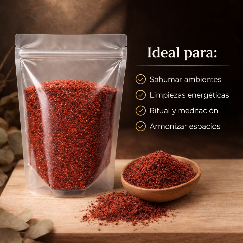 Tradicionalmente utilizada en rituales de limpieza energética, la sangre de drago se destaca por su aroma intenso y su uso en prácticas de purificación, protección y meditación. Su formato en polvo permite una combustión rápida y práctica al utilizarla sobre carbón vegetal.